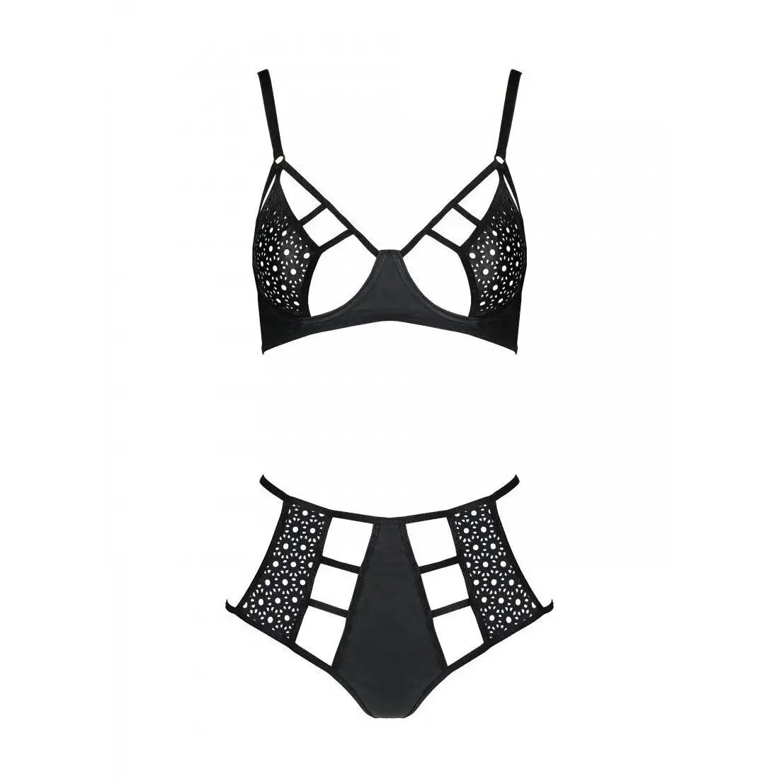 Бюстгальтер оснащен регулируемыми бретельками и чашечками на косточках для поддержки и подъема, а трусики имеют удобный эластичный пояс, который идеально сидит на бедрах. Перфорированный дизайн придает стильный вид этому классическому комплекту, что делает его идеальным для тех, кто хочет разнообразить свой гардероб нижнего белья.