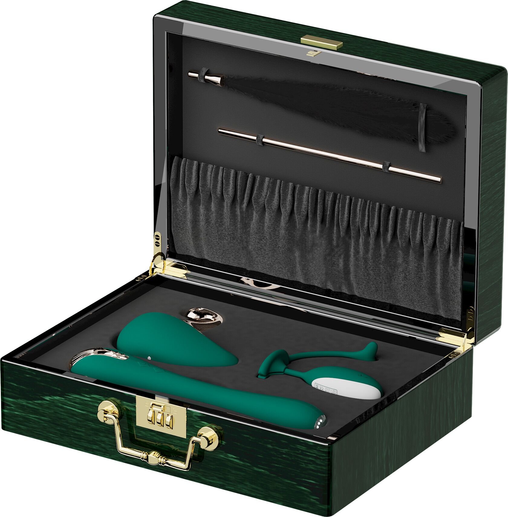 Кейc Pandora Box выполнен из материала под полированное дерево с золотистой фурнитурой и оснащен надежным кодовым замком. Внутри — специальные отделения для каждой игрушки, крепления для аксессуаров и бархатные кармашки для зарядных кабелей и инструкции.