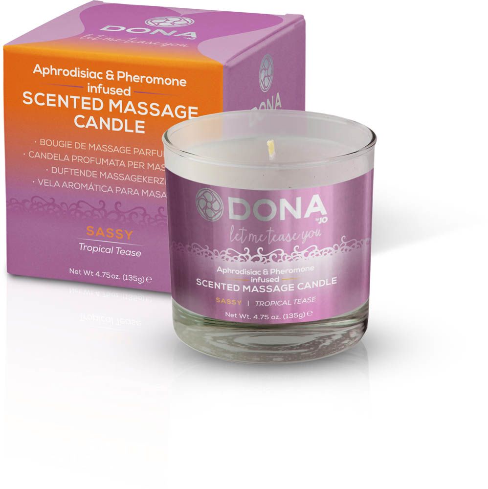 Ароматическая массажная свеча DONA Tropical Tease SASSY, роскошная массажная свеча, которая поднимет ваши чувственные ощущения на новый уровень. Эта 135-граммовая свеча изготовлена из натурального соевого воска и эфирных масел и обладает восхитительным тропическим ароматом, который дразнит ваши чувства.